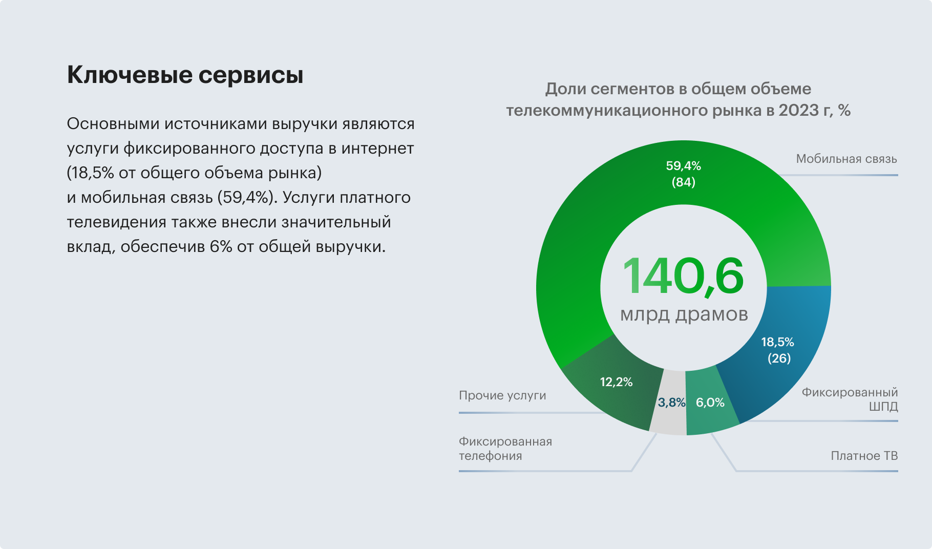 Оператор Viva также провел ребрендинг в 2024 году после смены собственника (МТС в начале 2024 года закрыла сделку по продаже 100% акций «МТС Армения» кипрской компании Fedilco Group Limited) и фокусируется на цифровой конвергенции, предлагая клиентам единую экосистему цифровых сервисов, включающих мобильную и фиксированную связь, телевидение, облачные сервисы, разнообразные приложения и инновационные ИТ-решения. Компания отмечала в годовом отчете, что рост ключевых показателей был обусловлен увеличением выручки от телекоммуникационных услуг, чему способствовал запуск тарифных планов с подписками на видеосервисы и безлимитным интернетом. Компания начала сотрудничество с платформой Kinodaran, которая занимается производством армянского видеоконтента: сериалы платформы доступны эксклюзивно только абонентам Viva. Аналогично в рамках продолжающейся программы цифровой трансформации Ucom запустил весной 2025 года UPlay — собственную ТВ — и медиаплатформу.