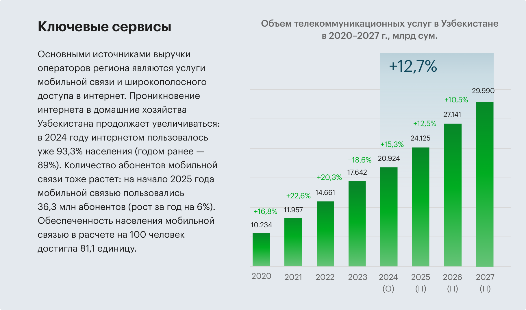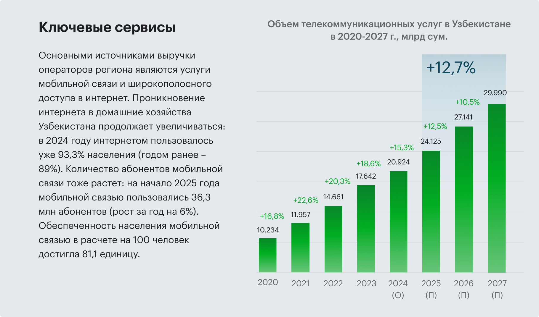 Крупнейшие телеком-провайдеры сосредоточены на модернизации сетевой инфраструктуры, расширении покрытия 5G и предоставлении цифровых сервисов. Рынок ШПД монополизирован: государственная компания «Узбектелеком» является лидером в сегменте домашнего интернета с долей 83%, поэтому большинство инфраструктурных проектов осуществляется одним игроком при поддержке государства. При этом рынок мобильной связи высококонкурентный, операторы стремятся опередить друг друга в разворачивании сетей 5G, чтобы выйти первыми на рынок с инновационными услугами. Кроме того, операторы расширяют портфель услуг новыми предложениями: в B2C-секторе – это стриминговые и финтех-сервисы, в B2B-секторе – облачные услуги и аналитика Big Data. Также операторы работают над улучшением клиентского опыта: например, Uztelecom запустил конвергентный тариф «единым счетом» за домашний интернет, IP-телефонию, телевидение и мобильную связь.